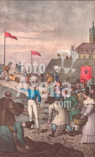 akg076696 Polish Revolution 1830/31. "Poland's last Revolution". (Warsaw's population prepares for the defence of their city). Chalk lithograph, coloured, by R. Weibezahl. From: Bildergallerie zu C. v. Rotteck's allgem. Weltgeschichte, Meißen and Pest (Goedsche and Wigand) 1832. Berlin, Sammlung Archiv für Kunst und Geschichte. Museum: Berlin, Sammlung Archiv für Kunst und Geschichte.
