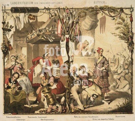 akg110388 Emancipation / Caricature. -"Laboratory of the Amazon Artillery".-Col. lithograph, c. 1850, by Ludwig Burger (1825-1884); 27.5 × 36cm. Sheet VIII of the series: "Das emancipirte Amazonen-Heer" (the emancipated Amazon Army) / 8 sheets compiled a. lithographed by Ludwig Burger, Berlin (August v. Schröter's Verlag) n. d. (c. 1850). Berlin, Sammlung Archiv für Kunst und Geschichte. Museum: Berlin, Sammlung Archiv für Kunst und Geschichte.