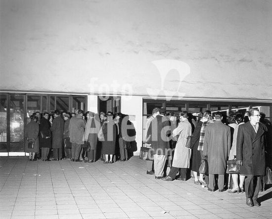akg1577657 Hochwasser. /-Hochwasser der Seine im Januar 1955: Überschwemmung in Courbevoie (Dép. Hautsde-Seine, Frankreich): Über Stege versuchen die Bewohner ihre Häuser zu erreichen.-/ Foto, 24. Januar 1955.
