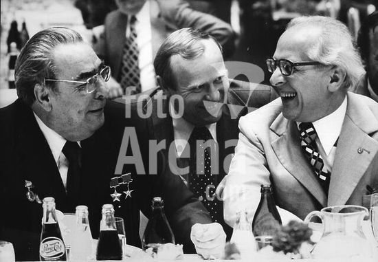 akg136143 Conference between USSR and its partners in Warsaw, 11 to 14 May 1955 (agreement of the "Warsaw Pact" between Albania, Bulgaria, East Germany, Poland, Romania, USSR, Czechoslovakia and Hungary). - The delegations in discussion: with their backs to the camera, the East German negotiators Walter Ulbricht and Otto Grotewohl. Photo, 13 May 1955. Copyright: For editorial use only.
