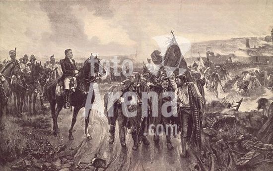 akg241301 Spanish War of Independence 1808/14. against Napoleonic troops: Gerona surrenders after a seven month siege by French troops under general Augereau. 1809. "The Surrender of Gerona 1809". Woodcut after a painting by Laureano Barrau (born 1864). From: Moderne Kunst, Berlin (R.Bong) undated. Berlin, Sammlung Archiv für Kunst und Geschichte. Museum: Berlin, Sammlung Archiv für Kunst und Geschichte.