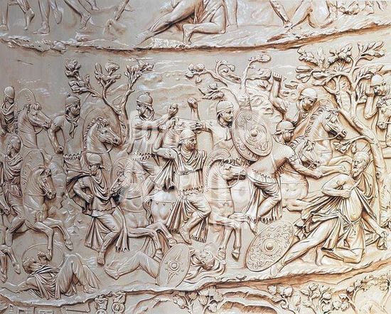 akg297766 Rome, Trajan's Column (113 AD). (Trajan's campaigns against the Dacians 101/2 and 105/6 AD). Suicide of King Decebalus. Watercolour, undated, by Peter Connolly. (1935-2012) after the relief from Trajan's column. Copyright: Peter Connolly's artistic copyright cleared via akg-images. This artwork is not in the public domain. akg-images represents the artistic copyright of this artist, please contact us for more information and to clear the necessary permissions.