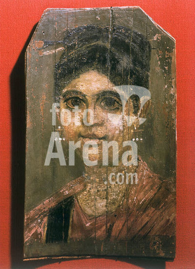 akg3001582 Antike Malerei, ägyptisch, römische Zeit, um 150/200 n.Chr.. - Mumienporträt einer Frau. - Wachsmalerei auf Holz, 32 x 19,2 cm. Herkunft: Fayum (Ägypten). Ehemals Genf, Collection de la Fondation Thétis. Author: ANONYMOUS.