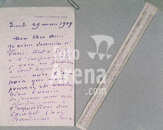 akg3657894 Claude Monet; French painter; Pris 14. 11. 1840 - Giverny 5. 12. 1926. - Handwritten letter Monets, Giverny, March 29, 1909, to the befriended writer and art critic Gustave Geffroy (1855-1926). - On the right, a composer's composer Charles Gounod (1818-1893) wrote his librettist Jules Barbier (1825-1901) on note paper, around 1873. Paris, collection Alain Nicolas.