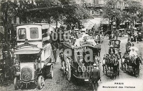 akg3880293 Paris (Frankreich), Straßenszene. "PARIS / Boulevard des Italiens" (Omnibushaltestelle an der Kreuzung Boulevard Montmartre / Boulevard des Italiens, 2./9.Arr.; links ein motorisierter Omnibus, rechts ein Pferdeomnibus). Fotopostkarte, undatiert, um 1911. Paris, Privatsammlung. Museum: Paris, Private Collection.