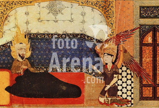 akg4447319 MUHAMMAD - the Gabriel archangel appears to Muhammad. Miniature draft from the ms. "The Night Travel". Herat, Iran, XV sec. Paris, National Library.