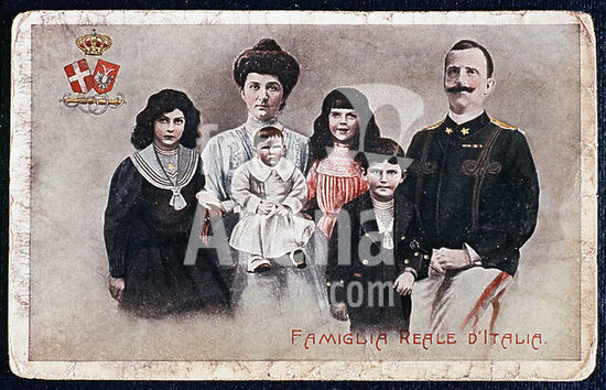 akg4448307 Family Savoy royal family: Vittorio Emanuele III di Savoia Elena and their children: from right Yolanda, Joan, and Mafalda Umberto. Hand-colored postcard, 1907.
