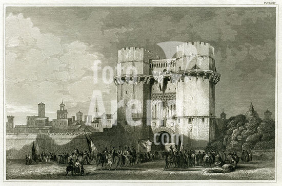 akg4507653 Spanien, Valencia, Stadttor " Torres de Serranos " , Stahlstich aus einem Buch, um 1840 . Spain, Valencia, town gate " Torres de Serrans " , steel engraving from a book , about 1840.