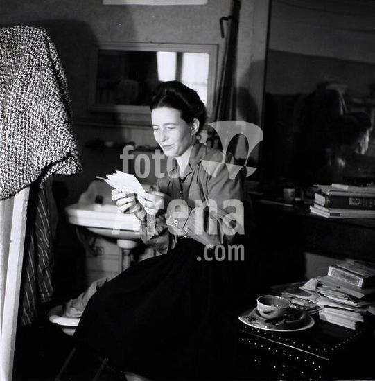 akg467600 Beauvoir, Simone de; French wirter. (companion of Jean-Paul Sartres). Paris 9.1.1908 - ibid. 14.4.1986. Simone de Beauvoir in her flat in Paris reading a letter. Photo, 1945, by Denise Bellon. (1902-1999). Copyright: Manipulation of image strictly forbidden.