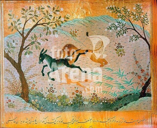 akg609684 A page from the fables 'Kalila and Dimna' in which the jackal tries to persuade the lion to stop devouring the beast and to devote himself to pious acts. Country of Origin: Islamic Middle East. Culture: Islamic. Place of Origin: Persia.