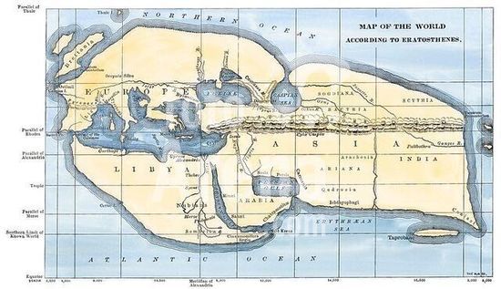 akg892636 Map of the world according to ancient Greek geographer Eratosthenes. Handcolored 19thcentury woodcut reproduction.