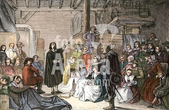 akg915441 Church service at Plymouth, Massachusetts, 1600s. Handcolored woodcut of a 19thcentury illustratioin.