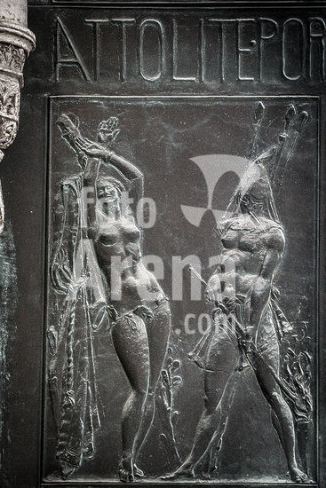 akg4899105 The statue of MOSES in the center of the tomb of POPE JULIUS II (1503-1513) in the basilica of St.Peter in chains (San Pietro in Vincoli) in Rome, Italy. Sculpture realized by italian artist MICHELANGELO BUONARROTI (1475-1564) in 1513-1515. Moses is flanked by RACHEL (left) representing contemplative life and LEAH representing active life.Commissioned in 1505 by Pope Julius II it depicts the biblical figure Moses with horns on his head and holding the stone tablets bearing the Ten Commandments.Marble, height 235cm. After restoration and with new lighting (2017).