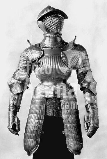 alb3637621 Reinforcing Pieces for the Tourney. Armorer: Kolman Helmschmid (German, Augsburg 1471-1532). Culture: German, Augsburg. Dimensions: as mounted, H. 37 in. (94 cm). Date: ca. 1510-15.In the late fifteenth century, specialized exchange and reinforcing pieces were devised that allowed a single field armor to be adapted for use in various forms of the tournament. The ensemble of pieces was known as a garniture. The armorers Lorenz Helmschmid (about 1445-1516) and his son Kolman, working for Emperor Maximilian I (1459-1519), were among the principal inventors of the garniture. Exhibited here are some of the earliest pieces stamped with the mark of Kolman, the most innovative armorer of his generation.These reinforces represent an early form of garniture for the tourney, a combat fought by groups of horseman armed with blunted lances and swords. The decoration imitates the elaborately brocaded textile that was fashionable in court costume. Museum: Metropolitan Museum of Art, New York, USA.