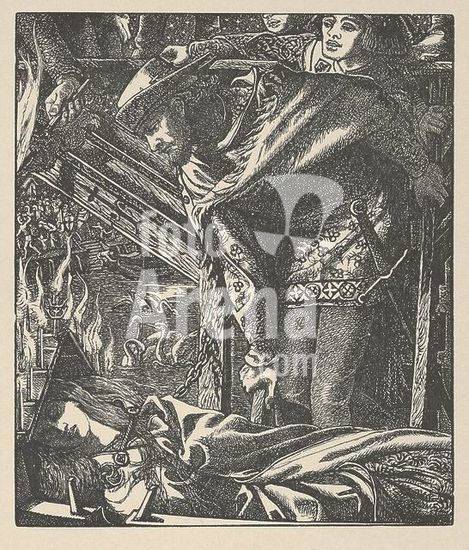 alb3633038 The Lady of Shalott (from Tennyson's Poems, New York, 1903). Artist: After Dante Gabriel Rossetti (British, London 1828-1882 Birchington-on-Sea). Dimensions: Image: 3 11/16 × 3 1/8 in. (9.3 × 8 cm)Sheet: 8 1/16 × 6 3/16 in. (20.4 × 15.7 cm). Engraver: Dalziel Brothers (British, active 1839-1893). Date: 1857-1903.Rossetti's 1857 illustrations of Tennyson--reissued here in 1903--incorporate startling effects derived from medieval and early Renaissance art. Space collapses, forms are cut off, and narrative details are inserted without concern for conventional perspective. The Lady of Shalott is a night scene dramatized by flaming candles and set on the river below Camelot. Rossetti criticized the engravers and insisted on many changes, delaying the publication. Museum: Metropolitan Museum of Art, New York, USA.