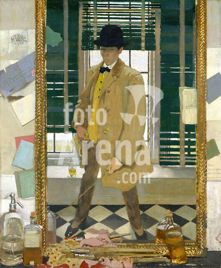 alb3633164 Self-Portrait. Artist: William Orpen (British, 1878-1931). Dimensions: 40 1/8 x 33 1/8 in. (101.9 x 84.1 cm). Date: ca. 1910.Born in Ireland, William Orpen studied in Dublin from 1892 to 1896 and went to London for further study at the Slade School of Fine Art in 1896. For the rest of his life, he lived and worked in London. There he received a number of honors, including membership in the New English Art Club, a governmental appointment as an official war artist during World War I, and a knighthood in 1918. He continued to work as a fashionable portrait painter during the 1920s, portraying wealthy and prestigious sitters in a traditional, highly polished style that rejected more recent developments in avant-garde art. He also produced a number of realistic self-portraits, both before and after the war, including Myself and Cupid (1910, Carnegie Institute, Pittsburgh) and Ready to Start (1917, Imperial War Museum, London).This self-portrait, also known as Leading the Life in the West, refers to Orpen's life as a young artist in the West End of London. Orpen stands reflected full-length in a mirror in his studio, wearing a bowler hat and holding gloves and a riding crop. A shelf below the mirror holds paintbrushes and rags, the tools of the artist's trade, as well as several bottles of liquor. Various pieces of correspondence, including an I.O.U. signed by Orpen, are tucked behind the frame of the mirror, further testifying to the pleasures and distractions of the painter's early career. The space of the picture is shallow but complex, with Orpen using his skills as a draftsman to resolve the challenges of surface, lighting, and reflection that he has set for himself. Museum: Metropolitan Museum of Art, New York, USA.