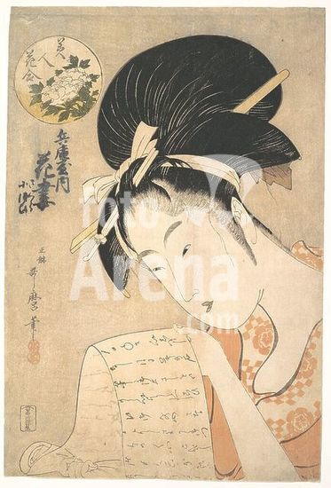 alb3633340 "The Courtesan Hanazuma Reading a Letter," from the series Beauties Compared to Flowers (Bijin hana awase). Artist: Kitagawa Utamaro (Japanese, ca. 1754-1806). Culture: Japan. Dimensions: H. 15 1/4 in. (38.7 cm); W. 10 1/4 in. (26 cm). Date: 1790s.The courtesan Hanazuma, of the Hyogoya brothel, uses both hands to hold a letter very close to her eyes. In the upper left corner is a white peony in a circle; the background is in pale powdered mica. Museum: Metropolitan Museum of Art, New York, USA.
