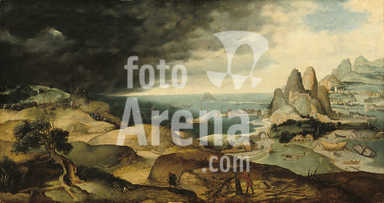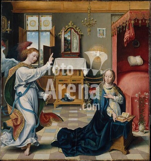 alb3633784 The Annunciation. Artist: Joos van Cleve (Netherlandish, Cleve ca. 1485-1540/41 Antwerp). Dimensions: 34 x 31 1/2 in. (86.4 x 80 cm). Date: ca. 1525.Gabriel and Mary are presented within an elaborately furnished interior that would have been familiar to sixteenth-century viewers. However, most of the objects, arranged unobtrusively within the room, carry symbolic meaning. The altarpiece and the woodcut on the wall, for example, show Old Testament prophets as prefigurations of New Testament themes. Influenced by Italian art, Joos appropriated a new canon of beauty, a new repertory of rhetorical gesture, and a striking grace of movement in his figures. Museum: Metropolitan Museum of Art, New York, USA.