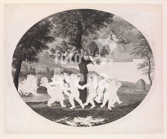 alb3635227 Amorini Celebrate the Rape of Proserpine. Artist: Francesco Rosaspina (Italian, Montescudo 1762-1841 Bologna); After Francesco Albani (Italian, Bologna 1578-1660 Bologna). Dimensions: oval image: 22 1/8 x 27 in. (56.2 x 68.6 cm)sheet (trimmed within platemark): 24 3/8 x 29 7/8 in. (61.9 x 75.9 cm). Date: 1805-12.Rosaspina believed that he could translate the color and style of a painting only if the work was in front of him as he engraved, which is one reason it took him so long to complete this, his most famous print. Because there were long intervals between his visits to Milan, where Albani's painting was located, several proofs in different stages of completion survive. Albani's famous painting of dancing cupids, now in the Pinacoteca di Brera, Milan, is based on Ovid's account of Proserpina's ravishment by Pluto (the Greek Hades). See 45.78.123 for the finished state. Museum: Metropolitan Museum of Art, New York, USA.