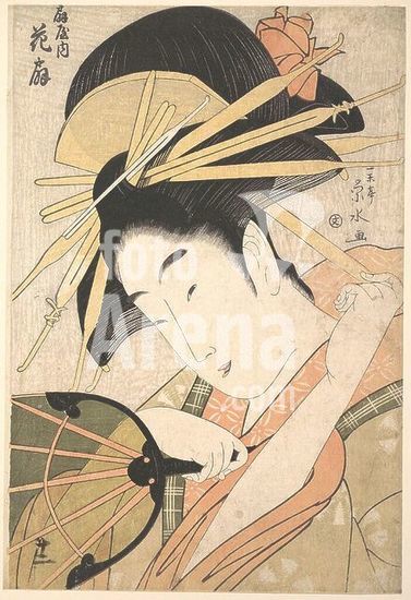 alb3636346 The Courtesan Hanaogi of the Ogiya Brothel (Ogiya no uchi Hanaogi). Artist: Ichirakutei Eisui (Japanese, active ca. 1793-1801). Culture: Japan. Dimensions: H. 14 5/8 in. (37.1 cm); W. 9 15/16 in. (25.2 cm). Date: 1790s.The courtesan Hanaogi fiddles with one of the hairpins holding her magnificent coiffure in place. She grasps a semitransparent circular fan that recalls her brothel's name, Ogiya, literally "House of Fans." Hanaogi was a name used by a succession of high-ranking courtesans of this house. This image is in all likelihood meant to represent Hanaogi VI, who was known to be talented in poetry, singing, and other literary arts. Museum: Metropolitan Museum of Art, New York, USA.