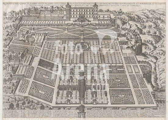 alb3636741 Speculum Romanae Magnificentiae: Tivoli Palace and Gardens. Artist: Attributed to Giovanni Ambrogio Brambilla (Italian, active Rome, 1575-99). Dimensions: sheet: 14 7/16 x 20 1/2 in. (36.7 x 52 cm). Publisher: Claudio Duchetti (Italian, active Venice and Rome, ca. 1565-died ca. 1585). Series/Portfolio: Speculum Romanae Magnificentiae. Date: 1581.This print comes from the museum's copy of the Speculum Romanae Magnificentiae (The Mirror of Roman Magnificence) The Speculum found its origin in the publishing endeavors of Antonio Salamanca and Antonio Lafreri. During their Roman publishing careers, the two foreign publishers - who worked together between 1553 and 1563 - initiated the production of prints recording art works, architecture and city views related to Antique and Modern Rome. The prints could be bought individually by tourists and collectors, but were also purchased in larger groups which were often bound together in an album. In 1573, Lafreri commissioned a title page for this purpose, which is where the title 'Speculum Romanae Magnificentiae' first appears. Lafreri envisioned an ideal arrangement of the prints in 7 different categories, but during his lifetime, never appears to have offered one standard, bound set of prints. Instead, clients composed their own selection from the corpus to be bound, or collected a group of prints over time. When Lafreri died, two-third of the existing copper plates went to the Duchetti family (Claudio and Stefano), while another third was distributed among several publishers. The Duchetti appear to have standardized production, offering a more or less uniform version of the Speculum to their clients. The popularity of the prints also inspired other publishers in Rome to make copies however, and to add new prints to the corpus. The museum's copy of the Speculum entered the collection as a group of 3 albums with inlaid engravings and etchings. The prints have since been removed, but the original place of each print within the album is contained in the accession number: 41.72(volume.place).Originally volume 3, plate 65 in the scrapbook. Museum: Metropolitan Museum of Art, New York, USA.