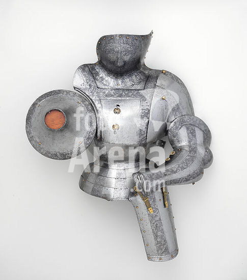 alb3631131 Armor. Armorer: Helmet, pauldrons, and vambraces attributed to Kolman Helmschmid (German, Augsburg 1471-1532). Culture: German, Augsburg. Dimensions: Wt. approx. 48 lb. 7 oz. (21.97 kg). Date: ca. 1525 and later.The helmet, pauldrons (shoulder defenses), and vambraces (arm defenses) of this armor are attributed to Kolman Helmschmid based on comparison with his known works. The helmet's distinctive snub-nosed visor appears to be a form that he originated and used on three other helmets, all dating from the mid-1520s. The decoration of these elements is typical of the style of Daniel Hopfer of Augsburg (about 1470-1536), a celebrated armor-etcher and printmaker, who is known to have decorated armors made by members of the the Helmschmid family.The remainder of this armor is composed of southern German elements from about 1520 to 1530, except for minor restorations. Museum: Metropolitan Museum of Art, New York, USA.