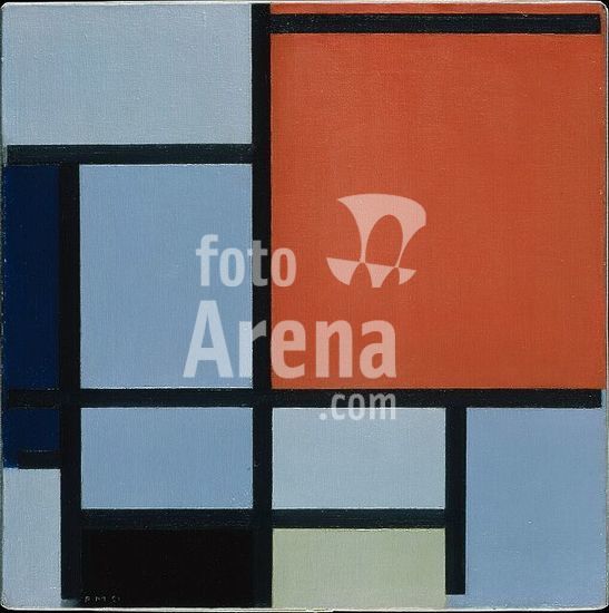 alb3638427 Composition. Artist: Piet Mondrian (Dutch, Amersfoort 1872-1944 New York). Dimensions: 19 1/2 x 19 1/2 in. (49.5 x 49.5 cm). Date: 1921.This is an early example of the geometric mode of painting that Mondrian called Neo-Plasticism. The abstract two-dimensional nature of these compositions formed a new universal aesthetic language that was popularized through the magazine De Stijl. The avant-garde movement known by the same name held the promise of constructing a postwar world with a common point of visual reference, a way of abolishing artistic and even social hierarchies. Here, Mondrian uses thick black lines to divide the canvas into eleven different rectangles, some of which are painted in primary shades of red and blue. He created lighter hues by mixing primary colors with white. Over time, Mondrian ceased diluting his palette altogether in favor of pure primary colors. Museum: Metropolitan Museum of Art, New York, USA.