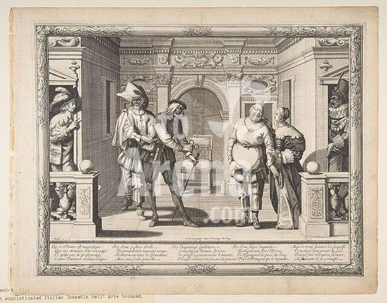 alb3645261 Actors at the Hotel de Bourgogne. Artist: Abraham Bosse (French, Tours 1602/1604-1676 Paris). Dimensions: Sheet: 11 9/16 × 14 3/4 in. (29.4 × 37.4 cm)Plate: 10 1/4 x 13 1/4 in. (26 x 33.7 cm). Publisher: Jean I Leblond (French, ca. 1590-1666 Paris). Date: ca. 1633-34.This print depicts six actors from a troupe of comedians led by Robert Guérin appear on stage at the theatre of the Hôtel de Bourgogne in Paris. The play depicted is unknown, but the characters can be identified as Turlupin (a roguish valet played by Henri Legrand), an old man (played by Gaultier-Garguille) and Gros Guillaume (the fat clown played by Guérin). Their characters are loosely based on those of Italian Comedy. Museum: Metropolitan Museum of Art, New York, USA.