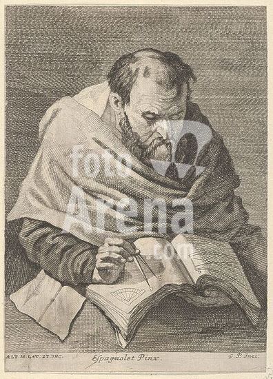 alb3680338 A mathematician seated at a table, working on mathematical equations, from a portfolio of prints of the Imperial Gallery of Paintings in Vienna; plate 34 of the series. Artist: Anton Joseph von Prenner (Austrian, Wallerstein 1683-1761 Vienna); After Jusepe de Ribera (called Lo Spagnoletto) (Spanish, Játiva 1591-1652 Naples). Dimensions: Sheet: 8 9/16 × 6 1/8 in. (21.7 × 15.5 cm). Date: 1728. Museum: Metropolitan Museum of Art, New York, USA.