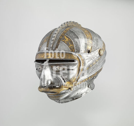 alb3683429 Close Helmet with Mask Visor in Form of a Human Face. Armorer: Attributed to Kolman Helmschmid (German, Augsburg 1471-1532). Culture: German, Augsburg. Dimensions: H. 12 in. (30.5 cm); W. 9 3/4 in. (24.8 cm); D. 13 in. (33 cm); Wt. 4 lb. 12 oz. (2146 g). Date: ca. 1515.Helmets fitted with masklike visors were a popular German and Austrian fashion about 1510 to 1540. With their visors forged and embossed as humorous or grotesque human masks, such helmets were often worn in tournaments held during the exuberant pre-Lenten (Shrovetide) festivals, celebrations somewhat akin to the modern Mardi Gras. Substitute visors of more conventional type were often provided for everyday use. Museum: Metropolitan Museum of Art, New York, USA.