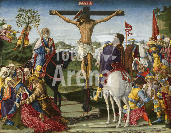 alb3703036 The Crucifixion. Dated: probably 1491. Dimensions: painted surface: 41.2 x 52.9 cm (16 1/4 x 20 13/16 in.) overall size: 42.6 x 53.8 cm (16 3/4 x 21 3/16 in.) framed (with three other paintings): 59.7 x 283.2 x 5.4 cm (23 1/2 x 111 1/2 x 2 1/8 in.). Medium: tempera on panel. Museum: National Gallery of Art, Washington DC. Author: BENVENUTO DI GIOVANNI.