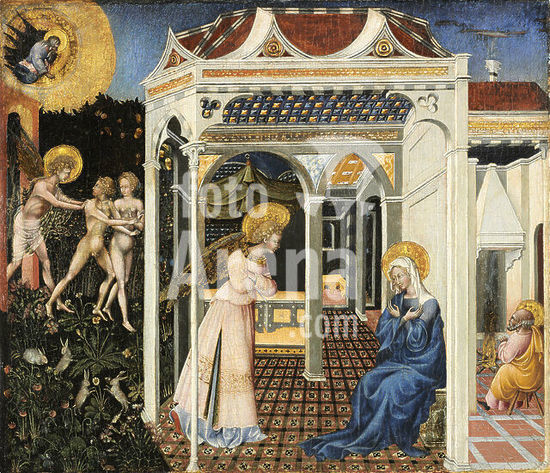 alb3704046 The Annunciation and Expulsion from Paradise. Dated: c. 1435. Dimensions: overall: 40 x 46.4 cm (15 3/4 x 18 1/4 in.) painted surface: 38.7 x 44.7 cm (15 1/4 x 17 5/8 in.) framed: 54.93 x 58.74 x 6.99 cm (21 5/8 x 23 1/8 x 2 3/4 in.). Medium: tempera on panel. Museum: National Gallery of Art, Washington DC. Author: GIOVANNI DI PAOLO.