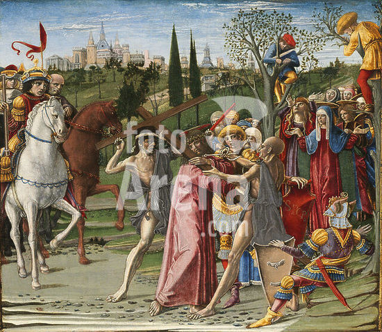 alb3704056 Christ Carrying the Cross. Dated: probably 1491. Dimensions: painted surface: 41.4 x 47.4 cm (16 5/16 x 18 11/16 in.) overall size: 42.8 x 50.1 cm (16 7/8 x 19 3/4 in.) framed (with three other paintings): 59.7 x 283.2 x 5.4 cm (23 1/2 x 111 1/2 x 2 1/8 in.). Medium: tempera on panel. Museum: National Gallery of Art, Washington DC. Author: BENVENUTO DI GIOVANNI.