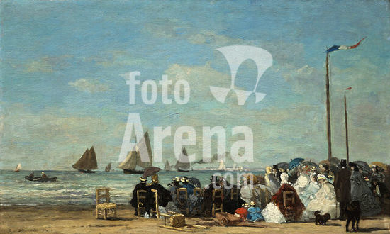 alb2066874 Bathers on beach at Trouville, 1869, Óil on canvas, 31 cm x 48 cm. Museum: MUSEE D'ORSAY, BUDAPEST, France. Author: EUGENE BOUDIN.
