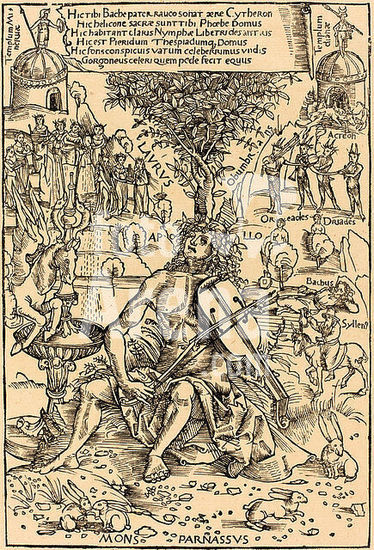 alb3717572 Apollo on Parnasus. Dated: published 1502. Medium: woodcut. Museum: National Gallery of Art, Washington DC. Author: Hans Süss von Kulmbach.