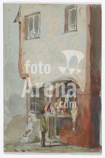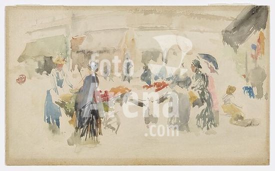alb9531175 Women, one holding an umbrella, inspect market stalls before shop fronts with awnings; unsigned. Watercolor on paper. Date: 1885. Origin: United States. Museum: Freer Gallery of Art and Arthur M. Sackler Gallery.