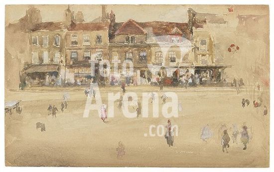 alb9531154 Facade of a row of three-storied houses and shop fronts; many small figures in the foreground; signed with the butterfly at upper right. Watercolor on paper. Origin: United States. Date: 1885-1886. Museum: Freer Gallery of Art and Arthur M. Sackler Gallery.