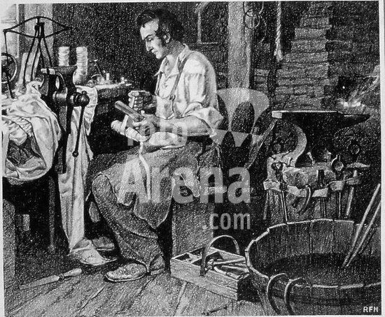 orz134635 THOMAS DAVENPORT BUILDS THE FIRST ELECTRIC MOTOR - ENGRAVING. 19th CENTURY.