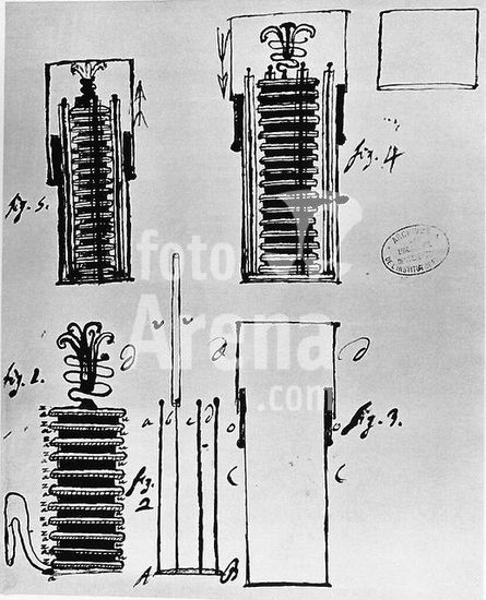 orz171406 Voltaic pile, the first electrical battery that could continuously provide an electric current to a circuit. It was invented by Alessandro Volta, who published his experiments in 1799. Author: ALEJANDRO VOLTA (1745-1827).