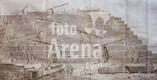 orz210234 'Construction of the Great Pyramid according to Herodotus' from 'L'origine des lois, des arts et des sciences', 1820. Author: ANTOINE YVES GOGUET.