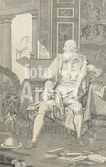 orz214944 PORTRAIT OF LEONARDO DA VINCI IN HIS STUDY IN MILAN - ENGRAVING - 18TH CENTURY. Author: DOMENICO CUNEGO. Location: PRIVATE COLLECTION.