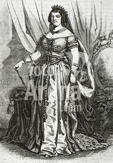 alb5335158 Joanna of Castile (known as Joanna the Mad) (1479-1555). Queen of Castile (1504-1555) and Aragon (from 1516), daughter of the Catholic Monarchs. Wife of Philip the Handsome. Portrait. Engraving by Antonio Roca Sallent. Las Glorias Nacionales, 1853. Author: Antonio Roca Sallent (1813-1864). Spanish engraver.