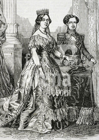 alb5343127 Spain. First Carlist War (1833-1840). Civil war that confronted Carlists, supporters of the Infante Carlos María Isidro de Borbón, against the Isabelinos (Elizabethans), defenders of Isabel II and the regent María Cristina de Borbón. Military review of 1st January 1834, under the presidency of Queen Isabella II. Illustration by Manuel Miranda. Engraving by José Gómez. Panorama Español, Crónica Contemporánea. Madrid, 1842. Author: MANUEL MIRANDA. 19th century Spanish artist. José Gómez. Spanish engraver.
