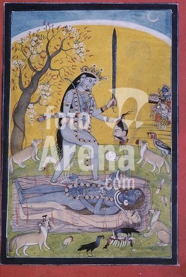akg1124937 Indian miniature, 18th century.-The goddess Kali, standing on her consort.-(Kali, 'the black one'; in Hinduism of time and change.) Gouache on paper. Museum: Bhuri-Singh-Museum., Chamba.