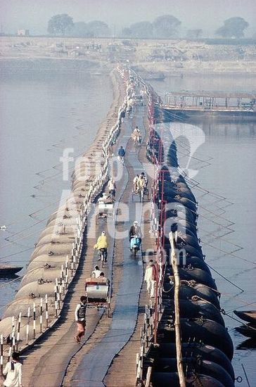 akg1032280 Benares-Varanasi (Uttar Pradesh, Indien), Pontonbrücke (Gangesbrücke zwischen Varanasi und Ramnagar während der Trockenzeit).-Ansicht.-Foto, Januar 1988.