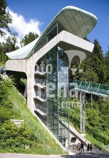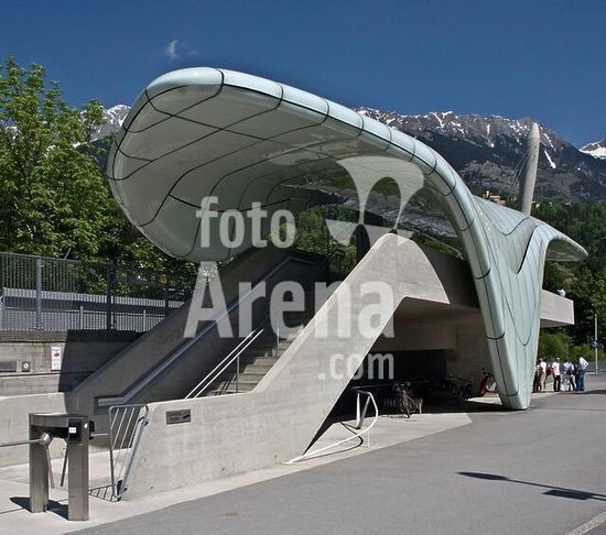 akg1032299 Innsbruck (Tirol, Österreich), Hungerburgbahn (Standseilbahn, Neubau, Inbetriebnahme 2007; Arch.: Zaha Hadid).-Teilansicht: Station Alpenzoo.-Foto, 2009.