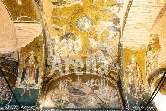 akg1720072 Türkei, Istanbul, Edirnekapi, Chora-Kirche (Kariye Camii), äusserer Narthex.Das Mosaik zeigt Szenen aus dem Leben Chrisi. Linke Figur hl. Andronikos rechts der hl. Georg. Halbrund, die Geburt Christi. Oben die Versuchung Christi.