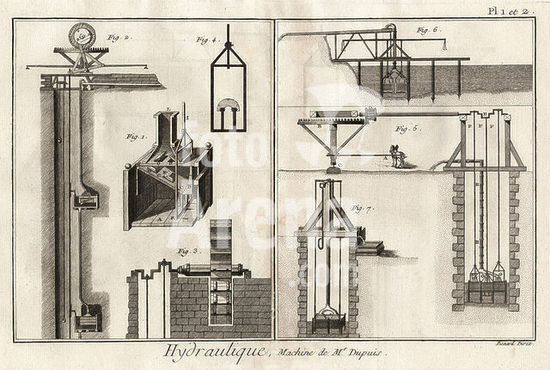 ado00025460 Hydraulic. Plate from the "Encyclopdie, ou dictionnaire raisonn des sciences, des arts et des mtiers"(Encyclopedia, or a systematic dictionary of the sciences, arts, and crafts) edited by Denis Diderot and Jean D'Alembert and published in France between 1751 and 1772. Author: Artiste inconnu.
