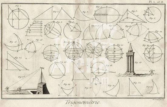 ado00025484 Trigonometry. Plate from the "Encyclopdie, ou dictionnaire raisonn des sciences, des arts et des mtiers"(Encyclopedia, or a systematic dictionary of the sciences, arts, and crafts) edited by Denis Diderot and Jean D'Alembert and published in France between 1751 and 1772. Author: Artiste inconnu.