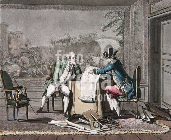 ado00058727 Jean-Charles de Folard giving lessons to the count Maurice of Saxe. Aquatint in colour of the 18th. century. Author: UNKNOWN ARTIST.